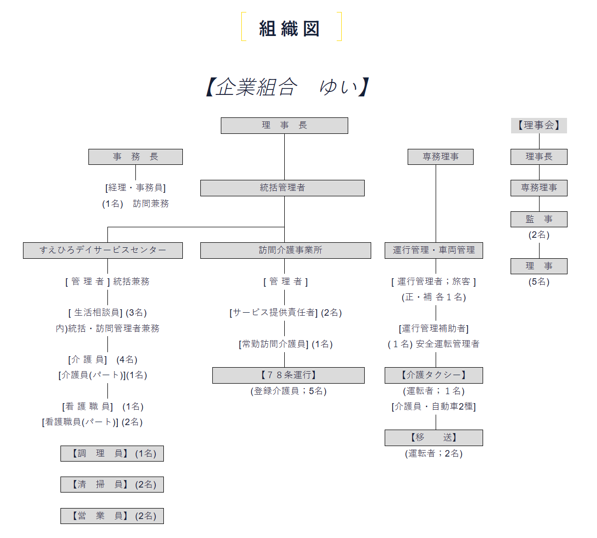 | [経理・事務員] | 統括管理者 | 専務理事 | |||||||||||||||||||||||||||||||||||||||||||||||||||||||